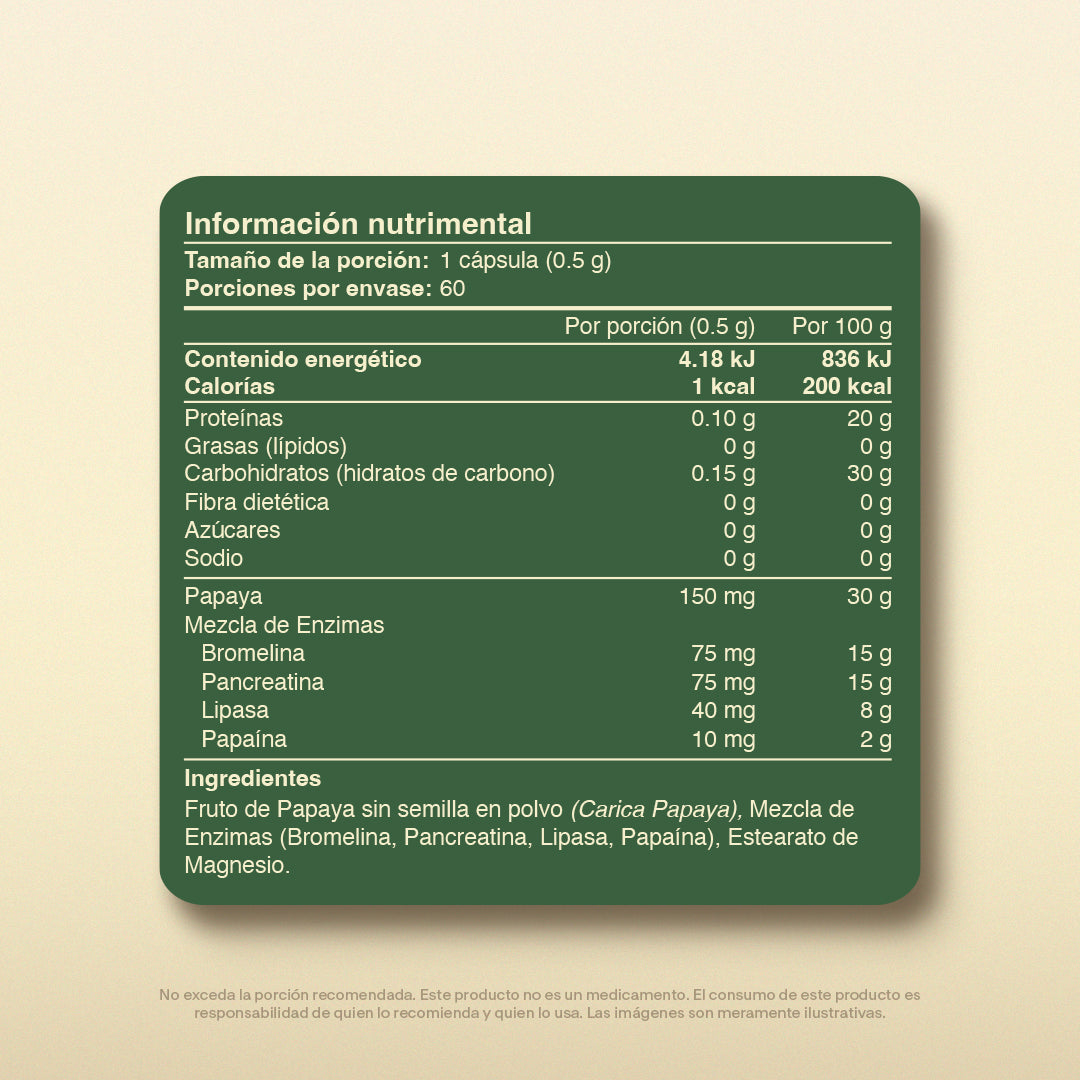 Porque ofrece una dosis estandarizada de enzimas digestivas, sin necesidad de preparar polvos o combinaciones caseras. Además, la cápsula protege los activos de la humedad y asegura constancia en cada toma.