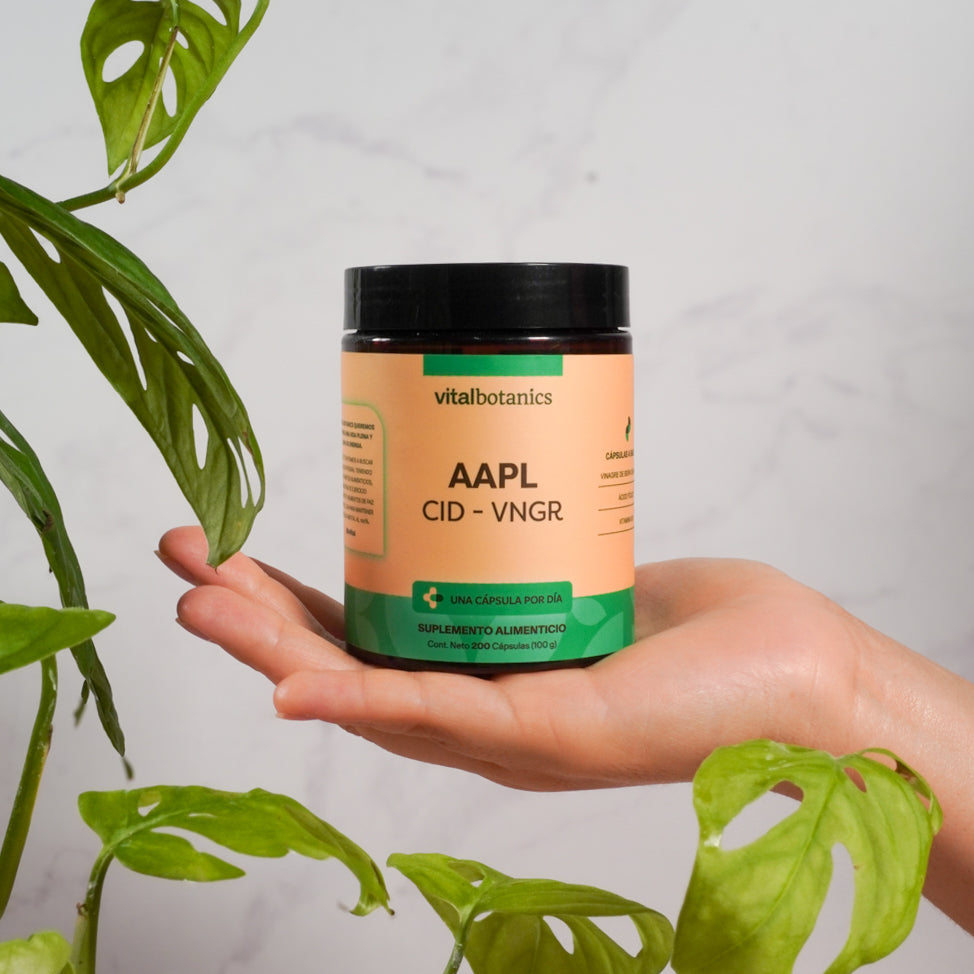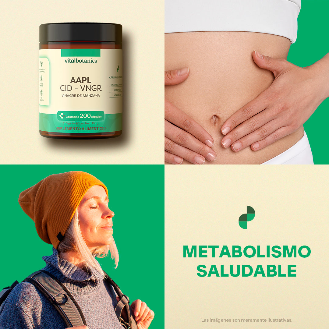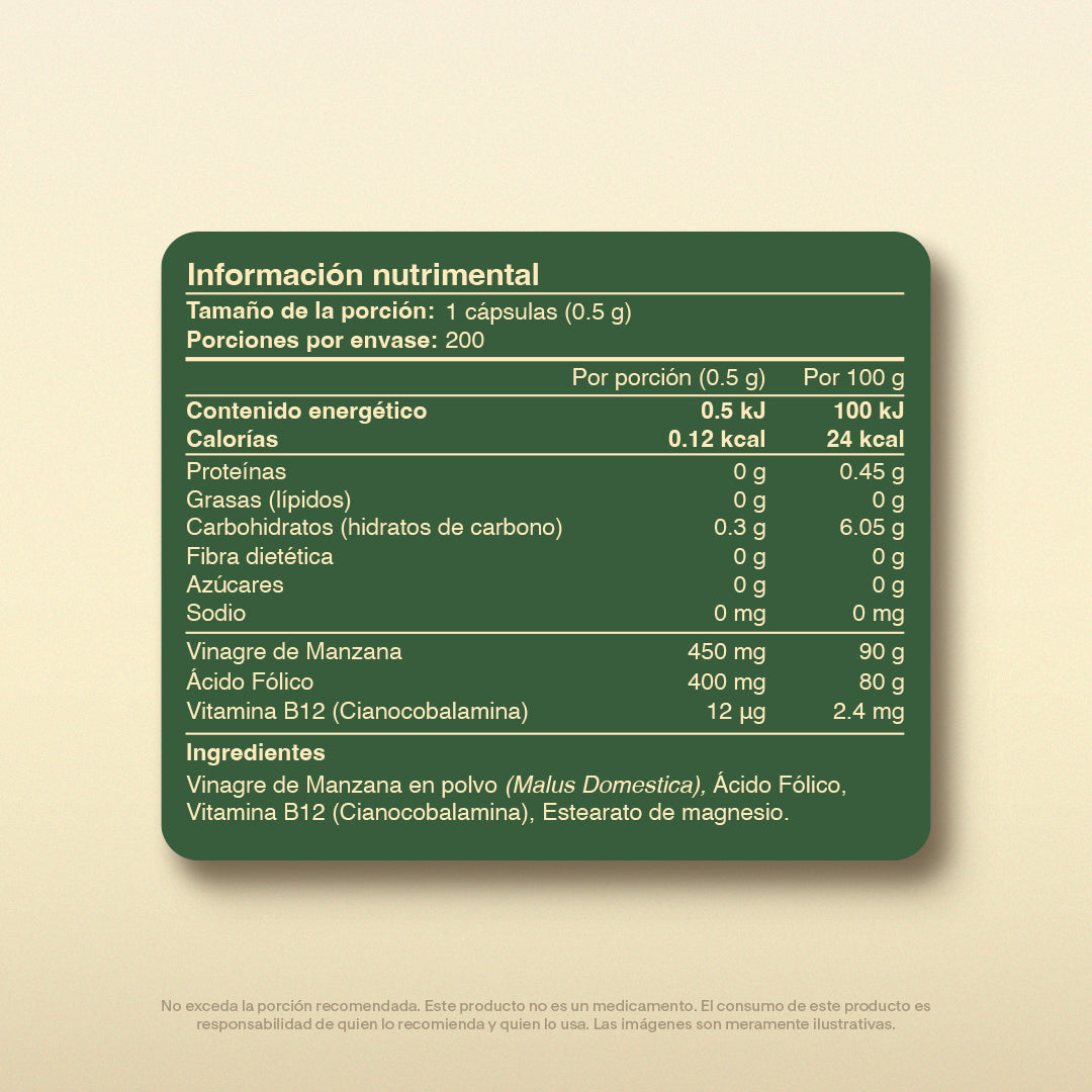 Cápsula con vinagre de manzana, ácido fólico y B12. En conjunto pueden contribuir a una digestión más cómoda, a manejar antojos de forma más consciente y a un metabolismo energético equilibrado.