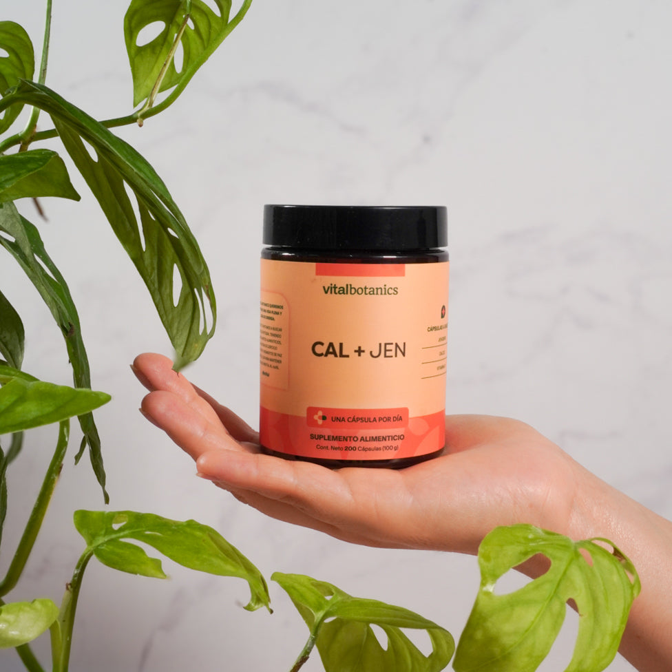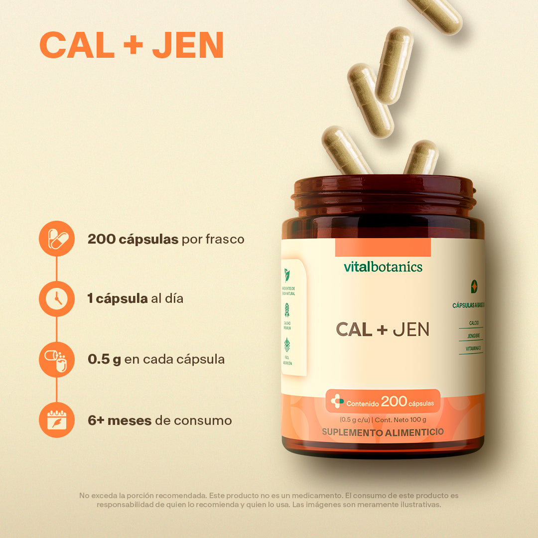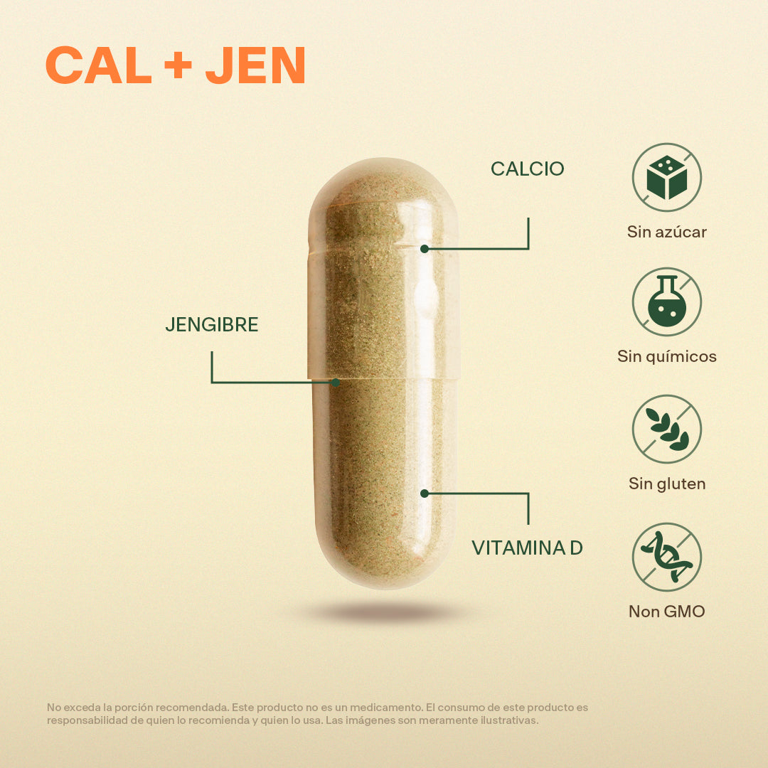 Cápsula con calcio, vitamina D y jengibre. En conjunto pueden contribuir a la salud ósea, a la absorción de minerales y al bienestar digestivo.