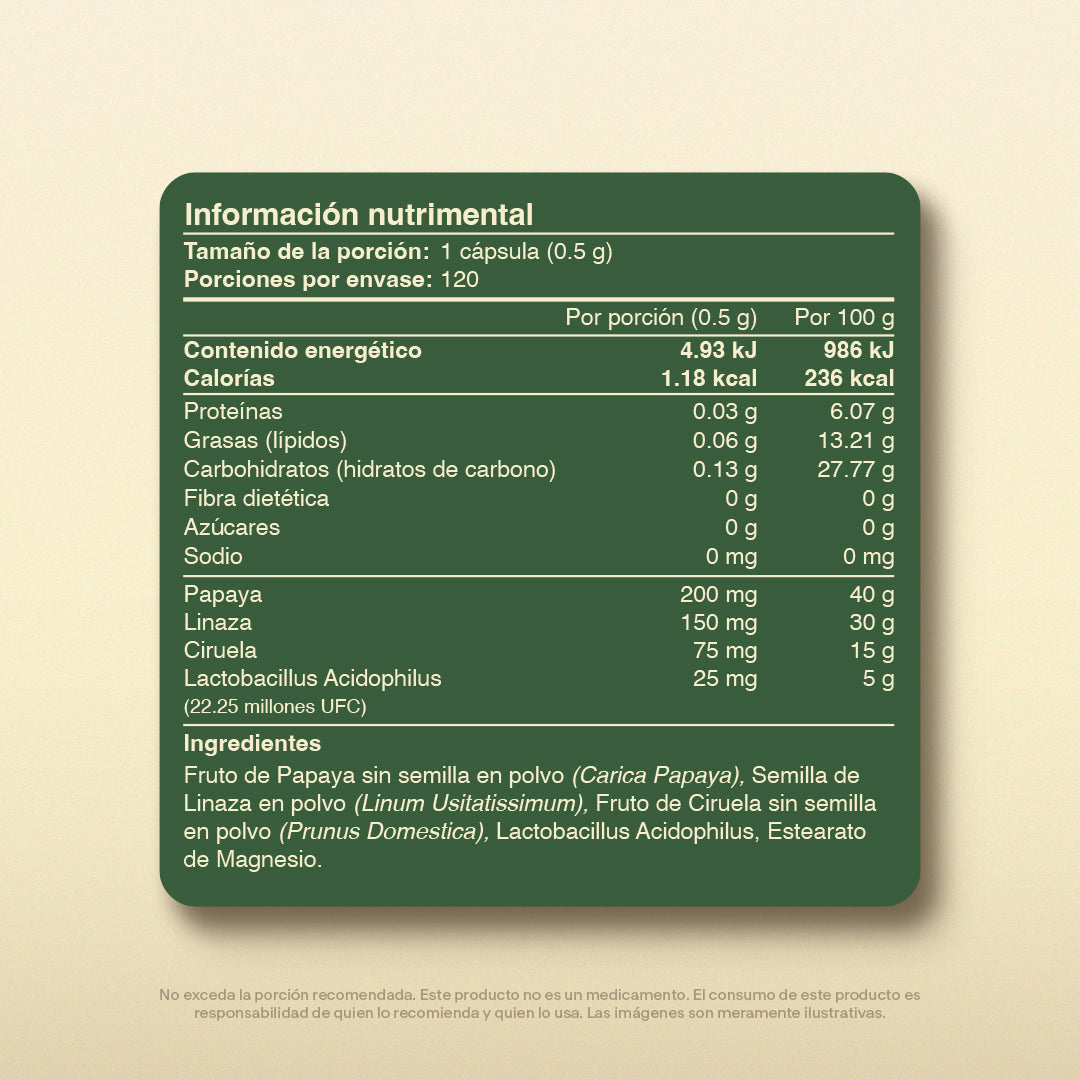 Porque concentra los beneficios de papaya, linaza, ciruela y probióticos en una forma práctica y estandarizada, sin necesidad de preparar jugos o mezclas altas en azúcar. Además, la cápsula protege a los probióticos y hace más fácil la adherencia diaria.