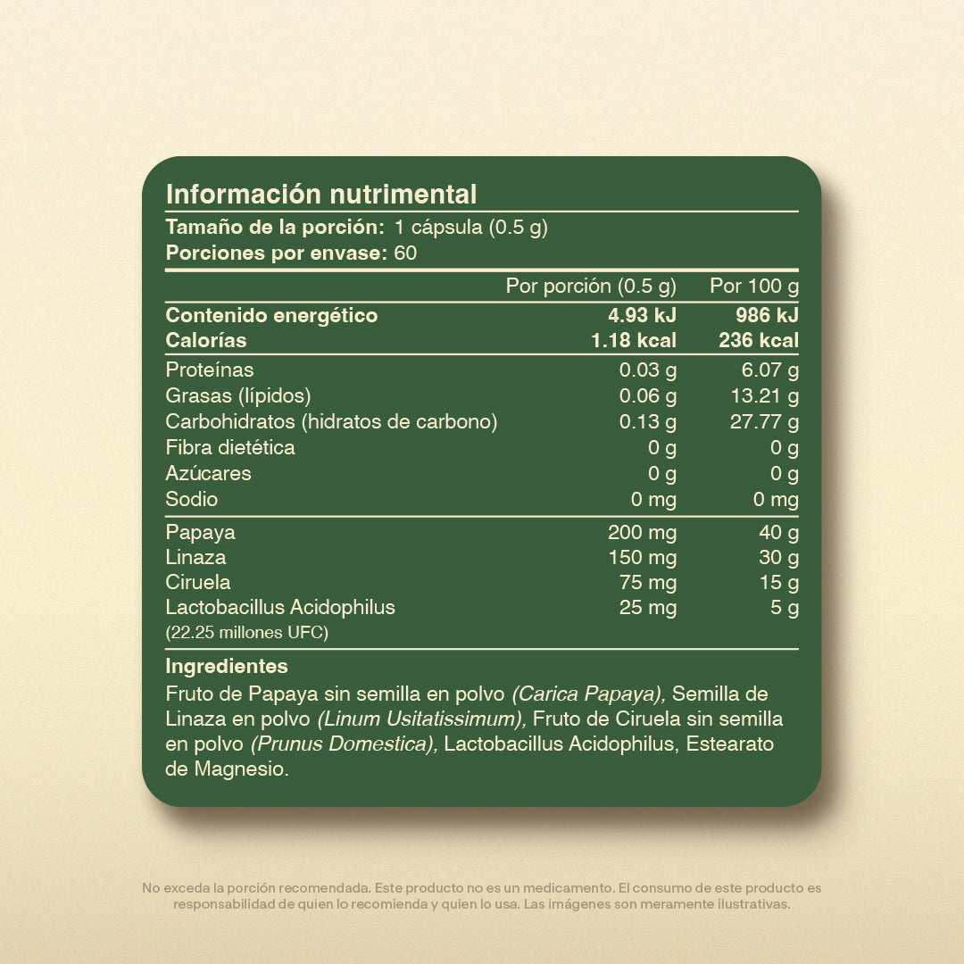Ciruela (Prunus domestica), Linaza (Linum usitatissimum), Papaya (Carica papaya) y Lactobacillus acidophilus (22.25 millones UFC)