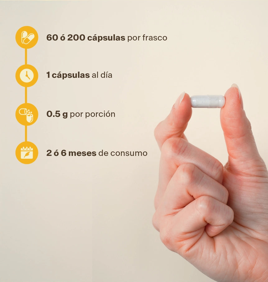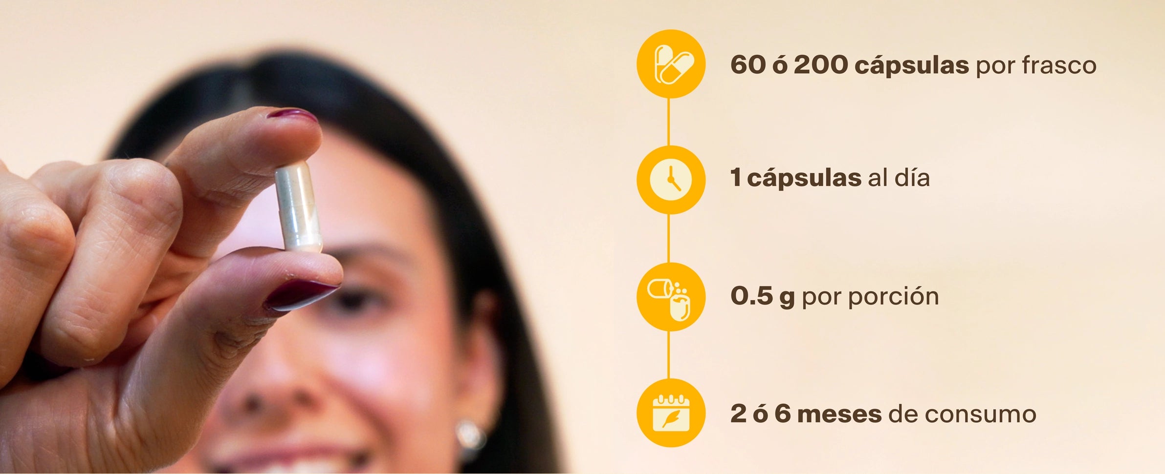 La recomendación es de 2 cápsulas al día, acompañadas de un vaso de agua. → Puedes tomarlas juntas en la mañana con el desayuno, o dividir (1 cápsula en la mañana y 1 en la tarde) para mejor absorción y tolerancia.
