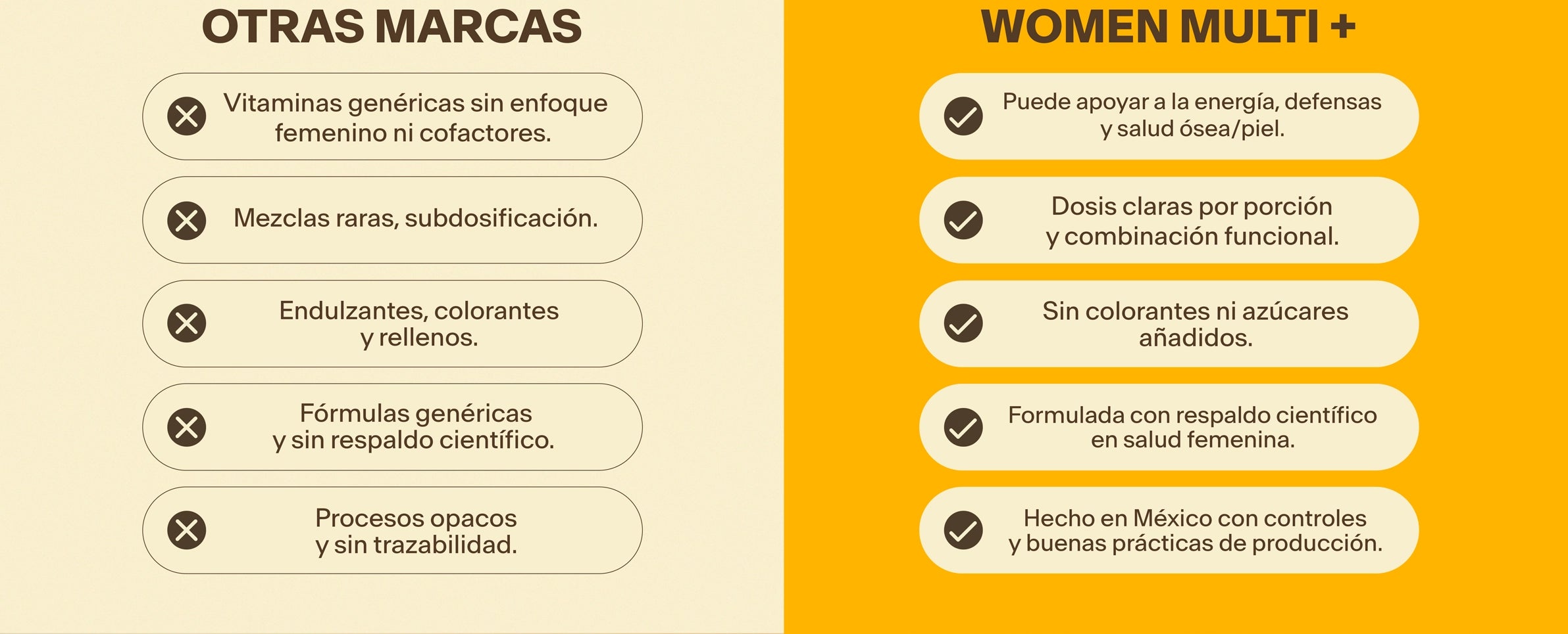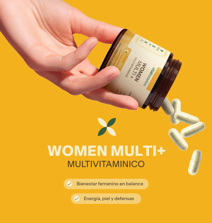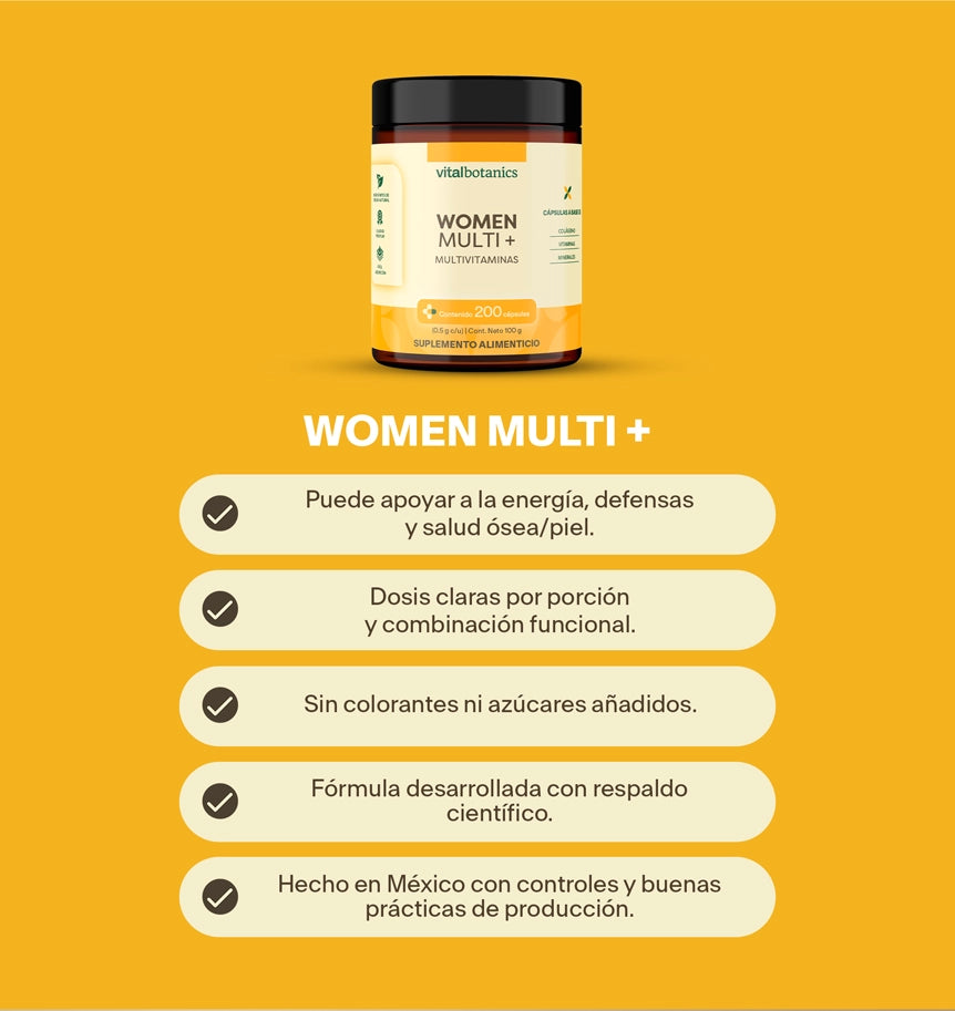WOMEN MULTI + es un multivitamínico en cápsulas diseñado especialmente para mujeres. Combina vitaminas, minerales y antioxidantes esenciales que pueden contribuir a tu energía diaria, equilibrio hormonal, salud de piel y cabello, defensas y bienestar integral. Está pensado para acompañarte en el ritmo de vida moderno, donde la nutrición sola muchas veces no alcanza a cubrir todas las necesidades.