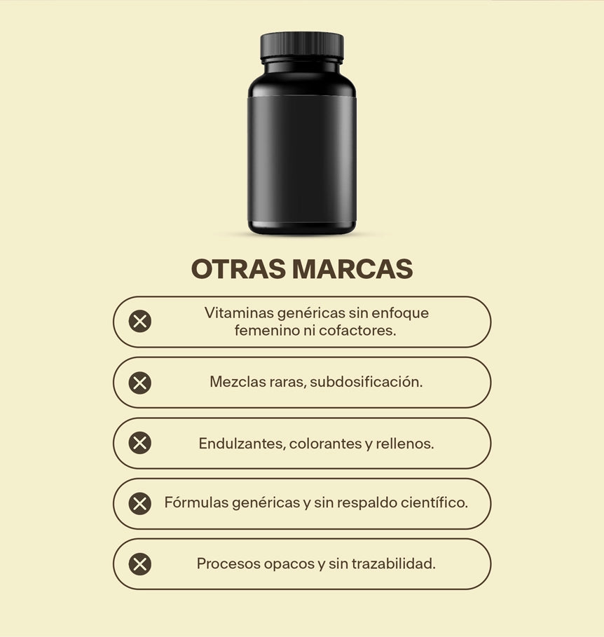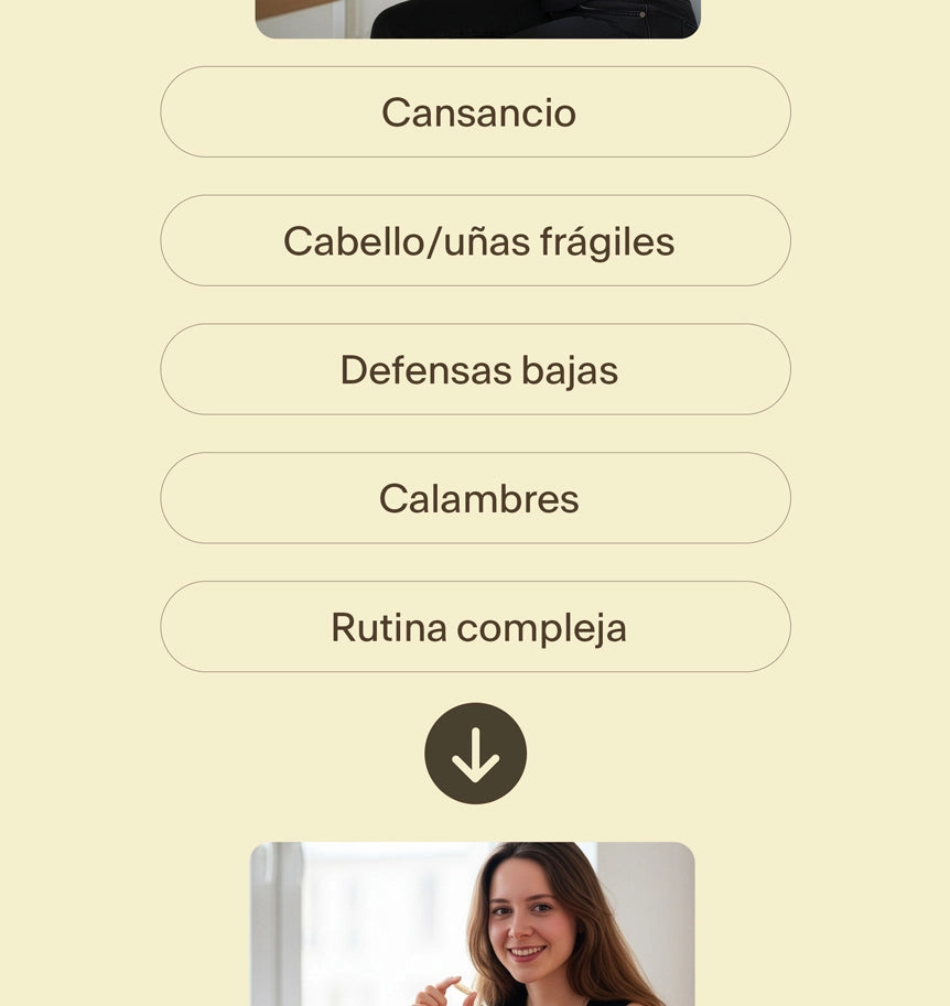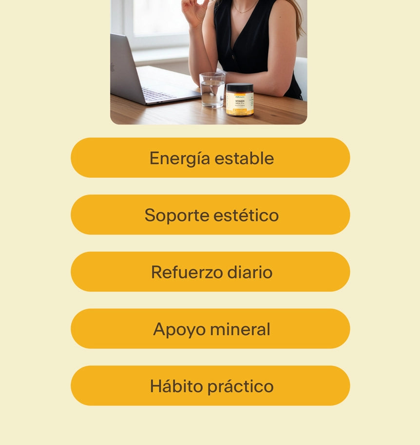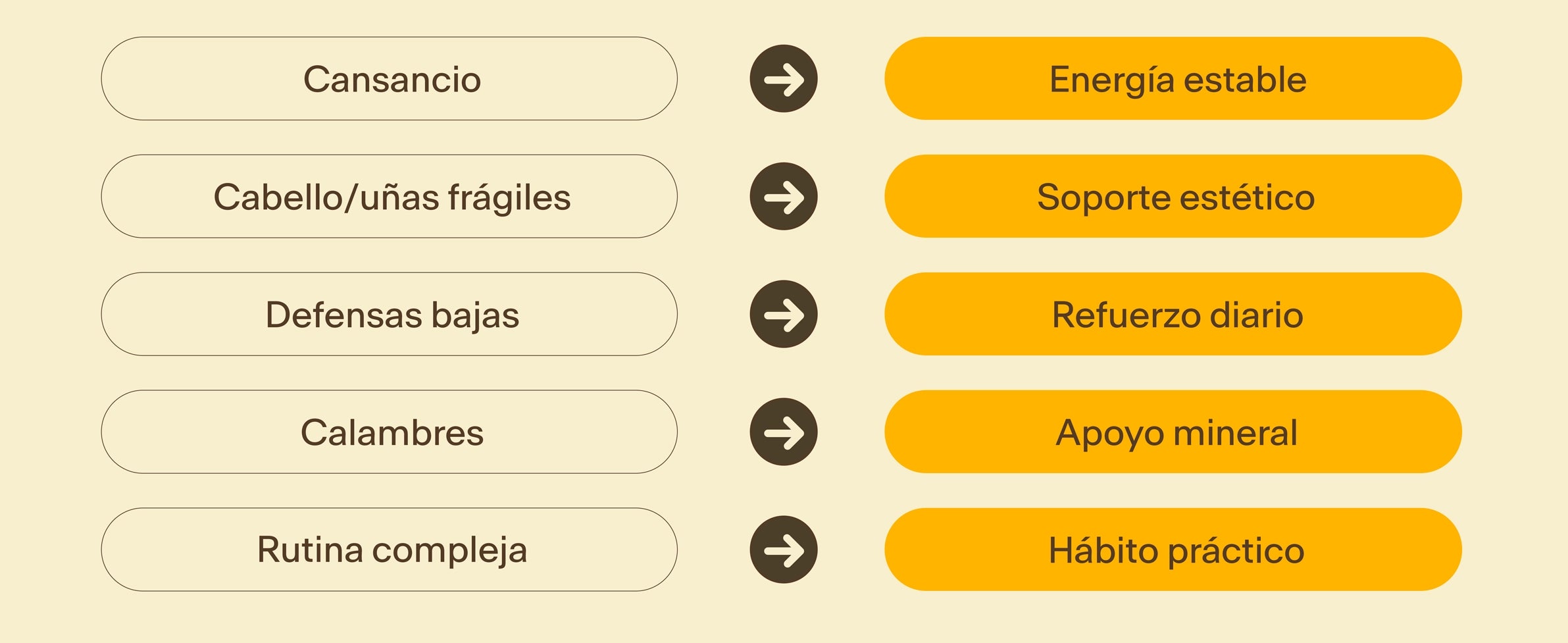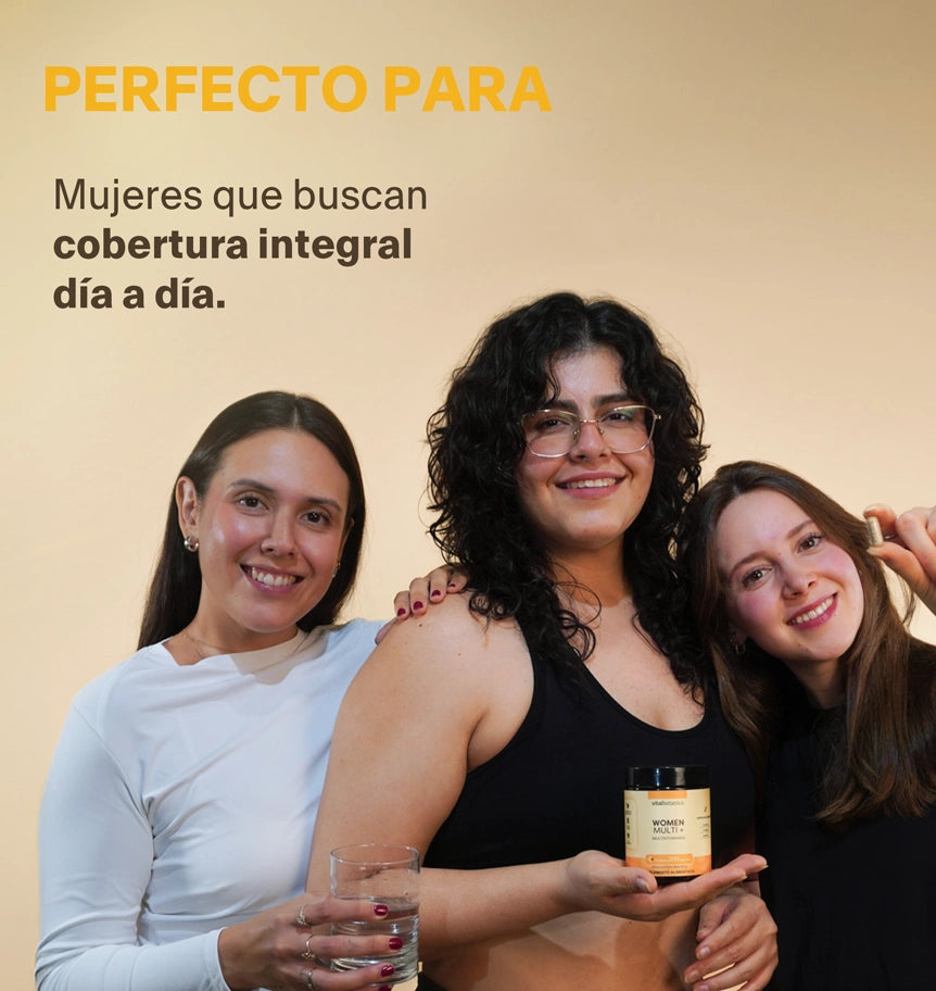 Energía y metabolismo: vitaminas del complejo B (B1, B2, B3, B5, B6, B12) ayudan a transformar nutrientes en energía utilizable. Sistema inmune: zinc, vitamina C y vitamina D refuerzan las defensas naturales. Salud ósea y muscular: calcio, magnesio y vitamina D contribuyen al mantenimiento de huesos y músculos fuertes. Cabello, piel y uñas: biotina, colágeno y antioxidantes ayudan a mantenerlos sanos y resistentes. Equilibrio femenino: hierro y ácido fólico son claves para bienestar durante el ciclo y etapas de alta demanda. Los resultados dependen de cada persona; no todos responden igual.