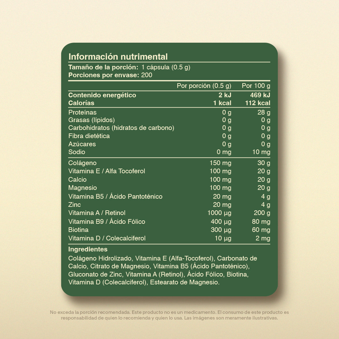 Vitamina A (Retinol), Biotina, Vitamina B5 (Ácido pantoténico), Vitamina B9 (Ácido fólico), Vitamina D (Colecalciferol), Calcio, Magnesio, Zinc y Colágeno (Hydrolyzed collagen).