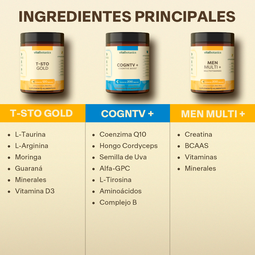 Esta combinación de suplementos cuenta con activos de alta pureza, como vitaminas, minerales, aminoácidos y extractos naturales, para brindar un soporte integral al organismo. Su fórmula incluye BCAAs, Creatina, un Complejo de Vitaminas B, Vitamina D, Potasio, Zinc, L-Arginina, L-Taurina, Guaraná y Moringa, ofreciendo apoyo en enfoque, energía, rendimiento físico, recuperación muscular y metabolismo energético.