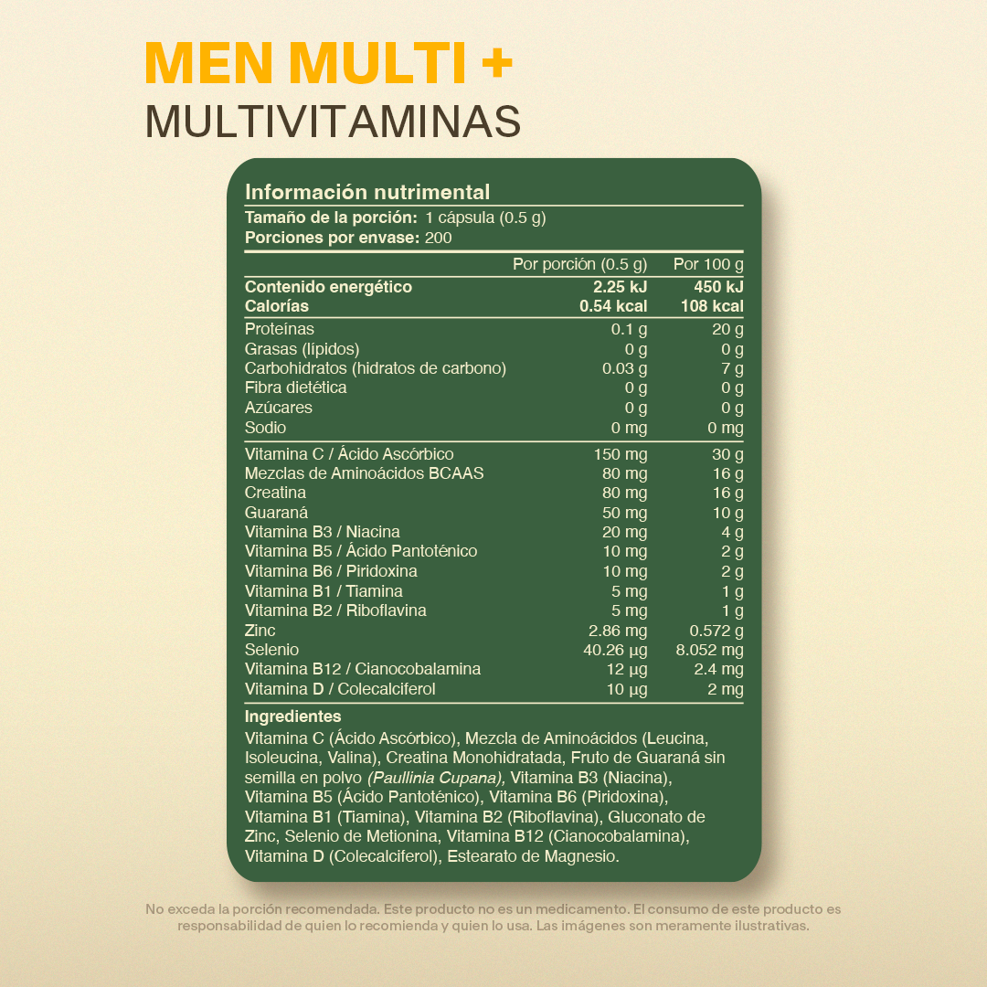 Multivitamínico masculino que apoya sistema inmune, energía diaria, salud cardiovascular y rendimiento físico general.