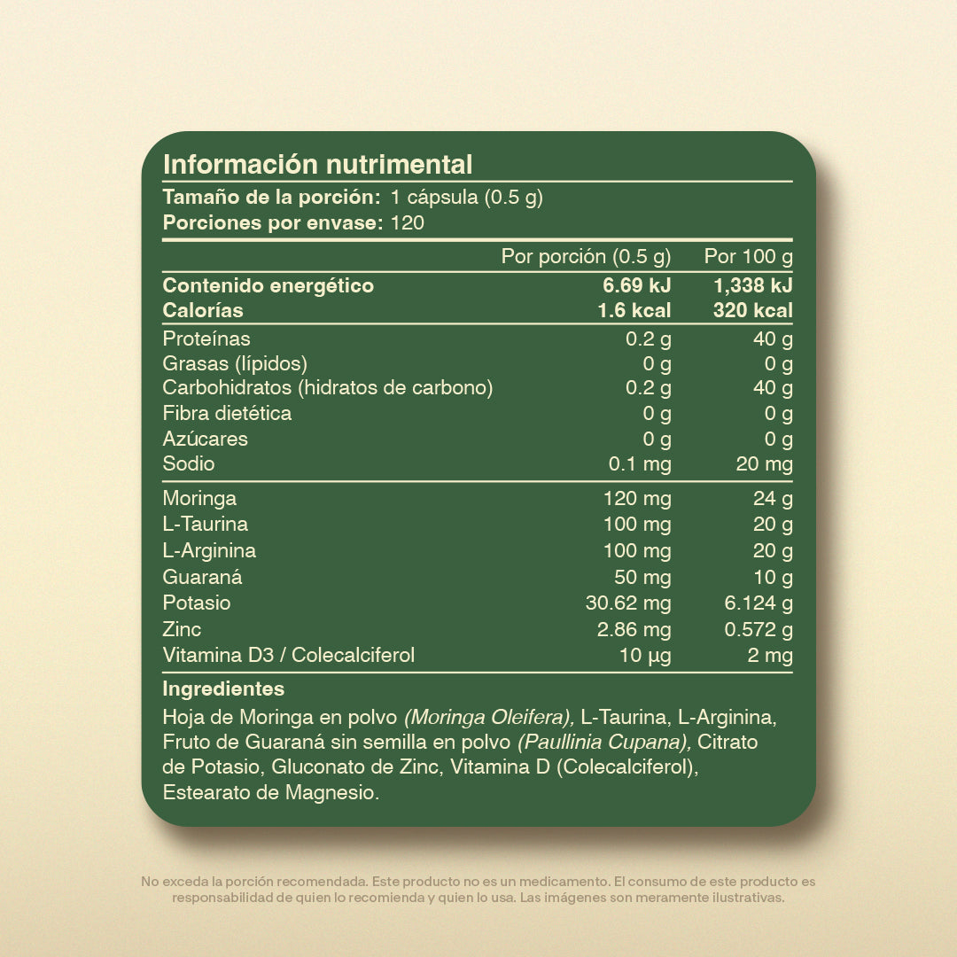 Vitamina D / Colecalciferol, Potasio, Zinc, L-Arginina, L-Taurina, Guaraná, Moringa